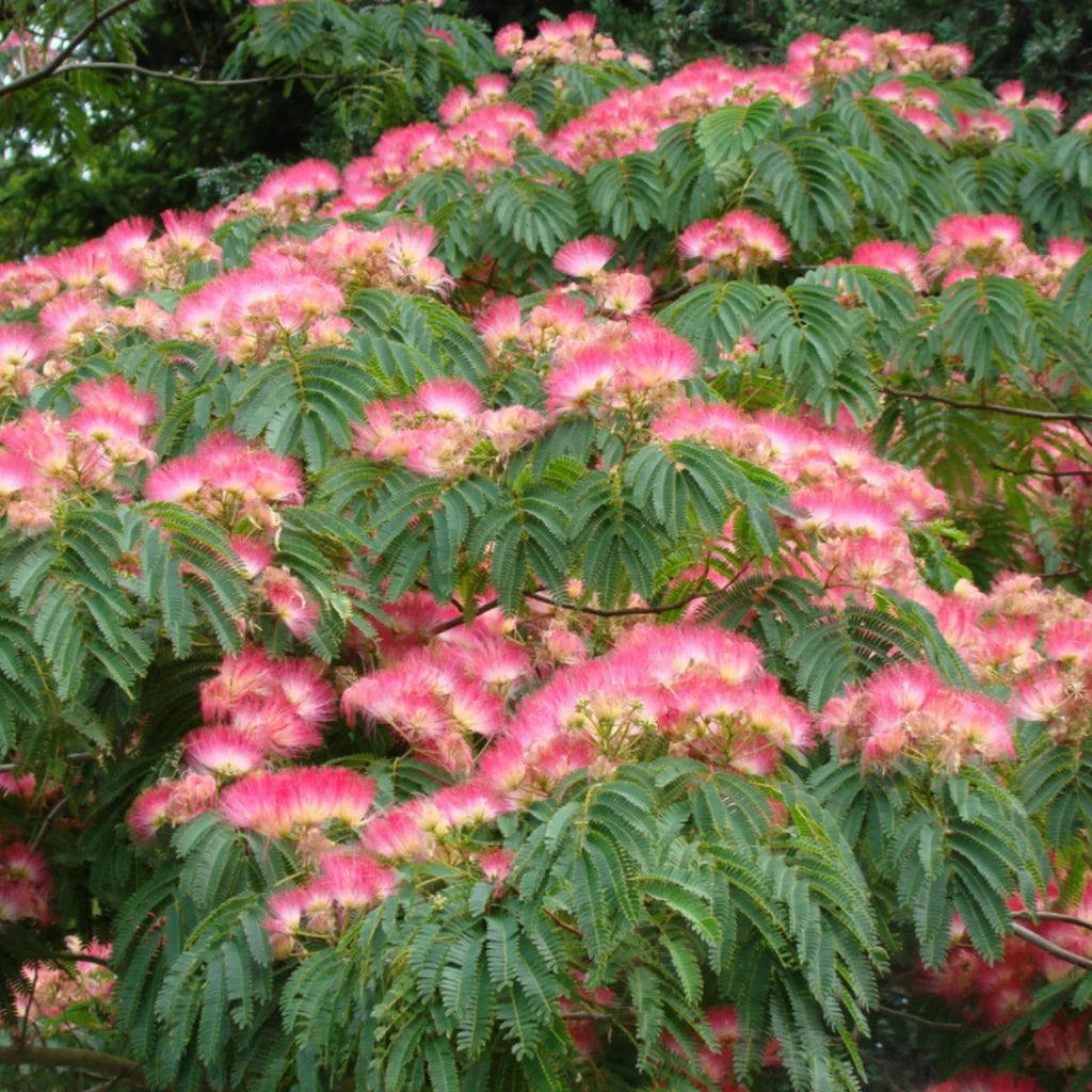 Arborele de mătase 'Ombrella' (Albizia julibrissin) este un arbore ornamental spectaculos, apreciat pentru frunzișul său fin, asemănător unei ferigi, și florile pufoase, roz intens, cu parfum delicat. Cultivarul ‘Ombrella’ este cunoscut pentru coroana sa largă, în formă de umbrelă, și coloritul roșiatic al frunzelor tinere. Ideal pentru grădini mediteraneene sau exotice.
